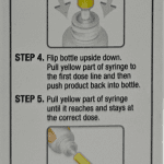- Flip bottle upside down. Pull yellow part of syringe to the first dose line and then push product back into bottle.