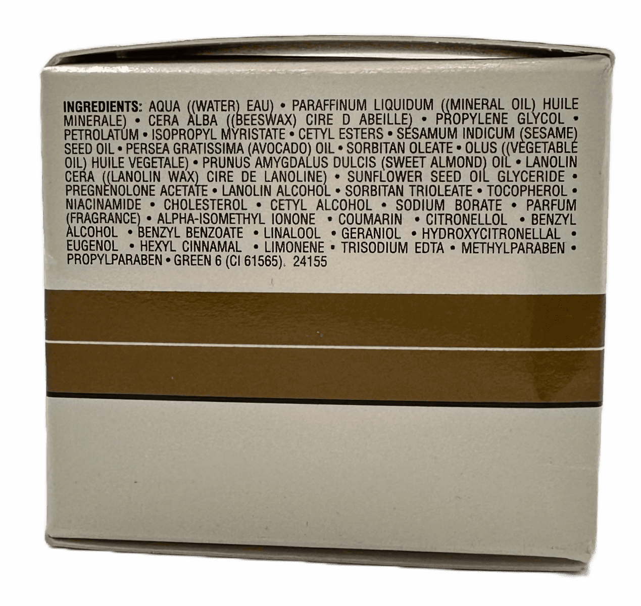 Aqua ((Water) Eau) Paraffinum Liquidum ((Mineral Oil) Huile Minerale) Cera Alba ((Beeswax) Cire D Abeille) Propylene Glycol. Petrolatum Isopropyl Myristate Cetyl Esters Sésamum Indicum (Sesame) Seed Oil Persea Gratissima (Avocado) Oil Sorbitan Oleate Olus ((Vegetable Oil) Huile Vegetale) Prunus Amygdalus Dulcis (Sweet Almond) Oil Lanolin Cera ((Lanolin Wax) Cire De Lanoline) Sunflower Seed Oil Glyceride • Pregnenolone Acetate Lanolin Alcohol Sorbitan Trioleate Tocopherol • Niacinamide Cholesterol Cetyl Alcohol Sodium Borate Parfum (Fragrance) Alpha-isomethyl Ionone Coumarin Citronellol. Benzyl • Alcohol Benzyl Benzoate Linalool Geraniol Hydroxycitronellal • Eugenol Hexyl Cinnamal Limonene Trisodium Edta. Methylparaben. Propylparaben Green 6 (Ci 61565). 24155